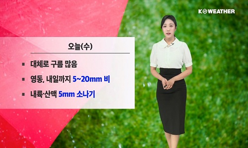 민간기상기업 케이웨더에 따르면, 동해북부해상에 위치한 고기압의 가장자리에 들겠다. 수도권을 비롯한 전국에 대체로 구름이 많겠다. 오후에는 내륙과 산맥에 소나기가 내리는 가운데, 강원영동은 흐리다가 오후부터 비가 내리겠다.