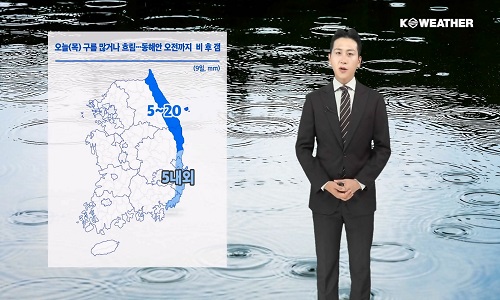 민간 기상기업 케이웨더에 따르면, 중국 북동지방에서 동쪽으로 이동하는 고기압의 가장자리에 들겠다. 이에 따라 전라도, 경남 서부, 제주도는 구름이 많겠고, 그 밖의 전국은 대체로 흐리겠다. 동해안은 오전까지 비가 오고 그치겠다.